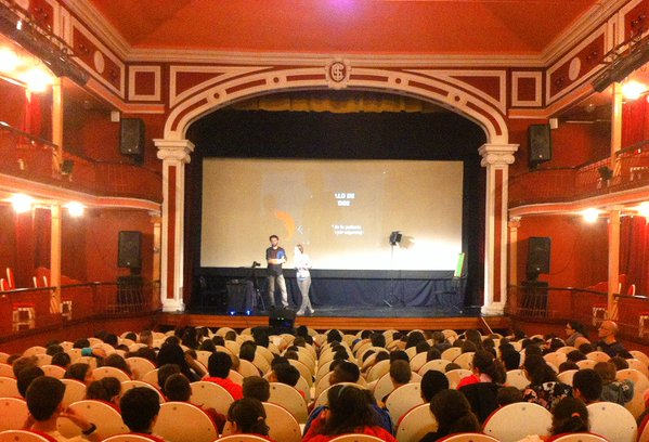 Seguidamente visionamos La mansión embrujada de Segundo de Chomón y nos fijamos en los trucos de cámara y de montaje realizados con técnicas como el stop-motion, la doble impresión, etc… Después de la proyección realizamos dos experiencias en el escenario: una animación stop-motion de un objeto (una tijeras) y unos efectos de composición de imágenes a escalas diferentes utilizando un fondo chroma. Con la ayuda de otros dos voluntarios pudimos hacer que un retrato de un cuadro cobrara vida asustando al vigilante de un museo y que un fantasma se asomara por la ventana de un castillo. ¡Y sin movernos del cine!