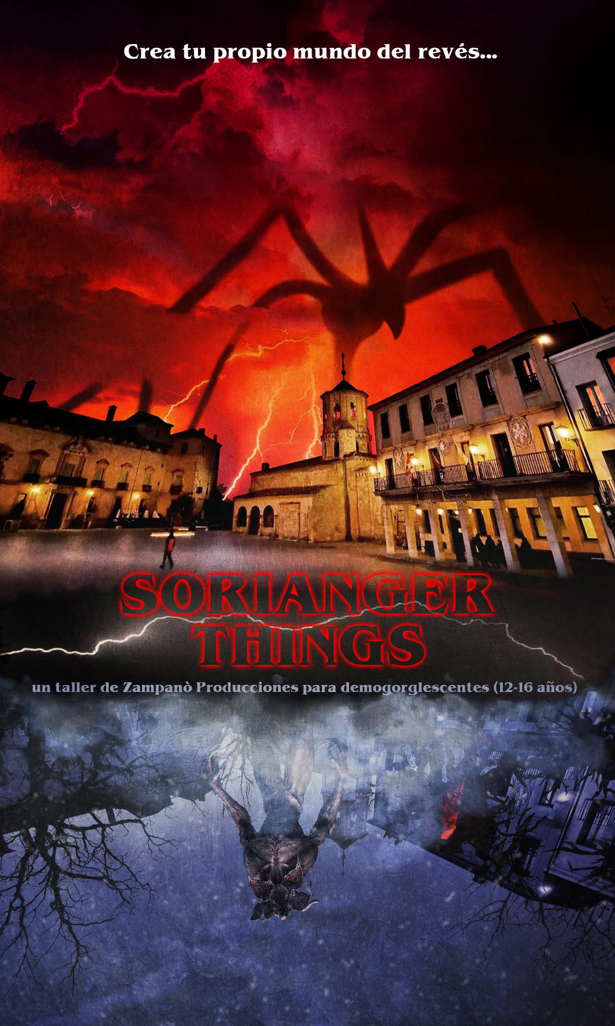 Taller de composición de imagen para adolescentes. Inspirándonos en el universo de Stranger Things, realizamos un taller para aprender a aplicar un estilo visual a unas imágenes del entorno urbano y paisajístico de Soria, integrando efectos y personajes de fantasía. La composición de diferentes capas de imagen se realiza con materiales de papelería y no por medio de técnicas digitales. Las transparencias, la retroiluminación, los recortables, la pintura spray, los elementos gráficos dibujados, todo vale una vez que se aprende a trabajar con capas.